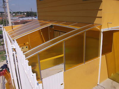 A Polysolution ( 041-3045-2600 ) - www.polysolution.com.br , apresenta mais uma aplicação de seus produtos inovadores, a cobertura fixa com placas de Policarbonato alveolar cristal com 6mm x 600 mm x 6000 mm - nessa aplicação os perfis de aluminio que sustentam o policarbonato são fornecidos pela própria Polysolution e atende a um vão livre de até 2500mm sem curvar, é um perfil de aluminio estrutural até 2,5 metros.